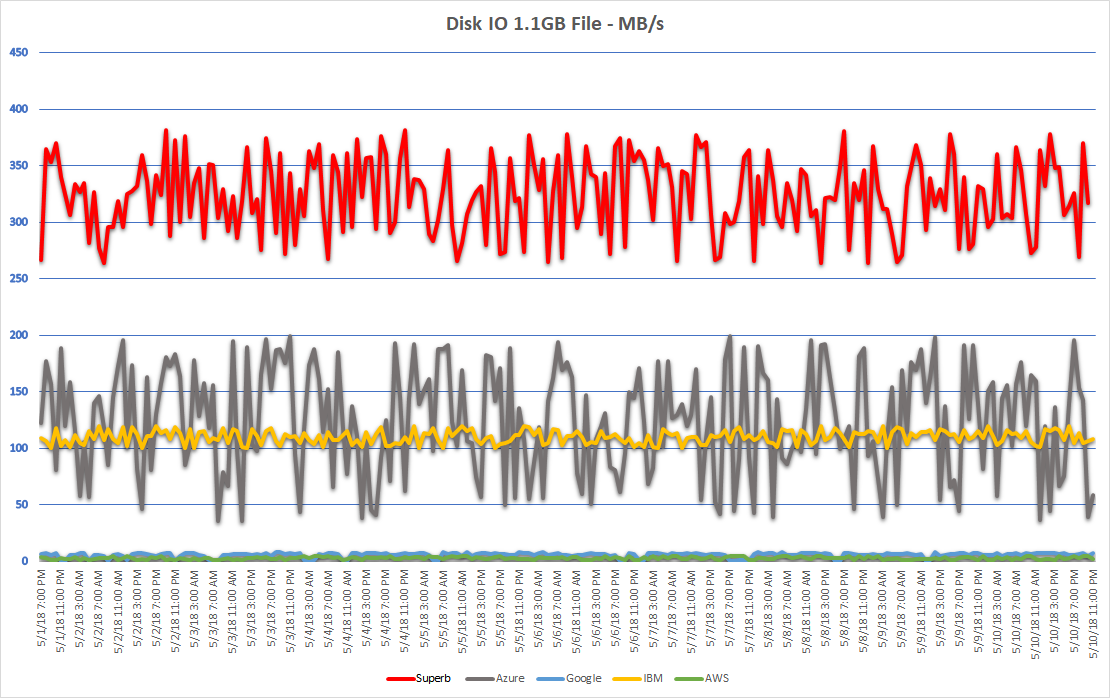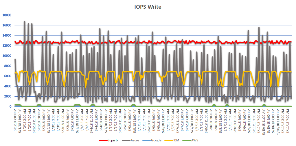 Our IOPS performance is the highest, and it is consistently consistent (yes, “double consistent”) – so you always know what you are going to get: there are no surprises. With Azure the IOPS, only a small a fraction of our performance, varies greatly, thus giving you highly variable and unpredictable roller coaster-like performance (the “noisy neighbor” effect common in oversold clouds), with IBM it is at about half of our IOPS for write and about 1/7th of our IOPS for write with a clear ceiling (maximum performance limitation), but with frequent drops (again the “noisy neighbor” effect, but less dramatic than Azure), while with AWS and Google it is consistently low, with only a few slight upward spikes.